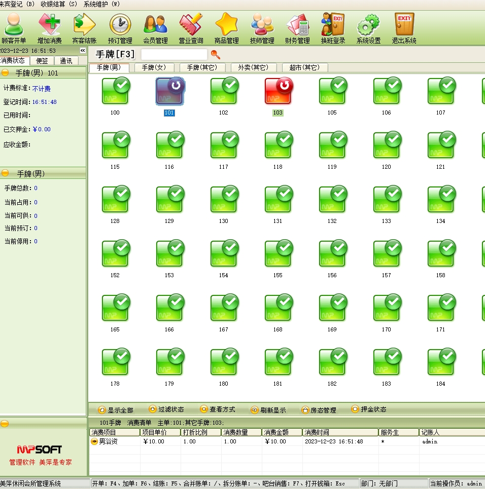 第一:休闲会所软件手牌:手牌可分为男宾手牌、女宾手牌和其它手牌,每个手牌就具体到某一来店登记的宾客,一般把手牌提供给一个客人后,在当前客人未退出占用状态前暂时无法提供给另一个客人消费。此项目在系统设置中设置,在宾客开单时使用。